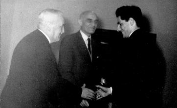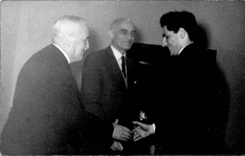 Od lewej: po obronie doktoratu. Przyjmuję gratulacje od Adama Taborskiego, lekarza weterynarii w ZOO wrocławskim... i od mojego promotora prof. Tadeusza Wróbla i recenzenta prof. Kazimierza Sembrata (1960)