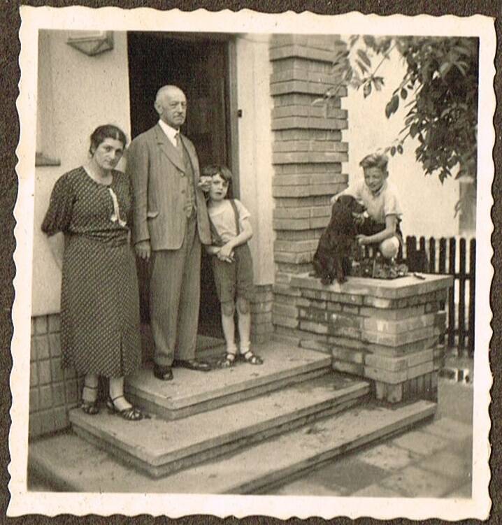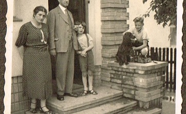 Po lewej: przy wejściu do naszego domu. Nasza rodzina: Helena, Kazimierz, ja i na murku brat Janusz z psem Hultajem(1937). Po prawej: rodzina jesienią 1938 roku
