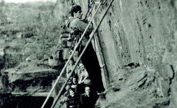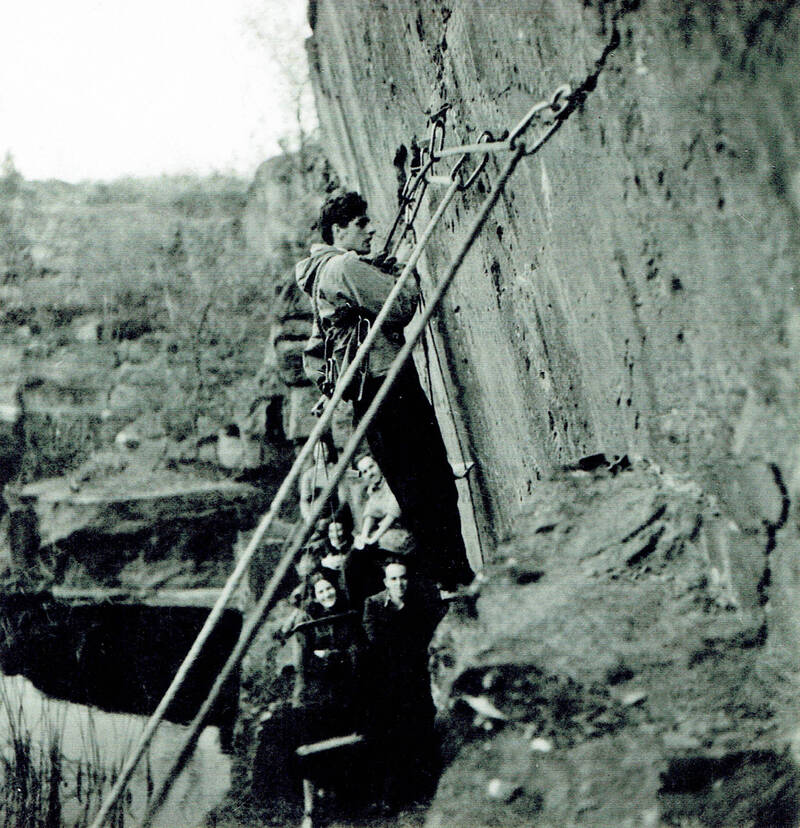 Od lewej: jako instruktor pokazujący „technikę hakową” na przewieszonej ścianie. W głębi śledzą to m.in. Jan Cygan, Ludwik Badian (późniejsi profesorowie). Obok ja zimą pod ścianą Świnicy.