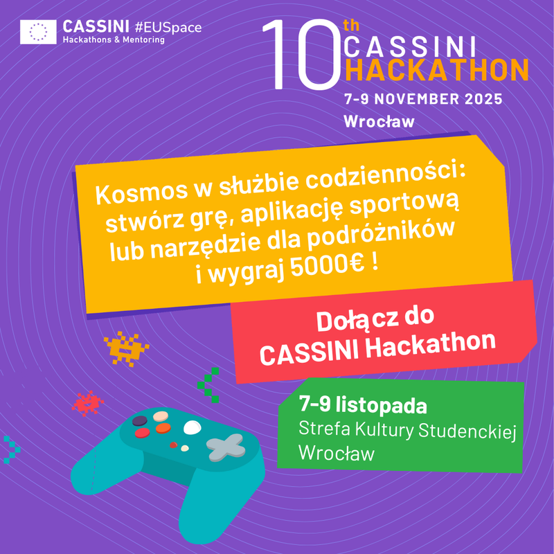 Trwa rejestracja do 10th CASSINI Hackathon, który w terminie 7-9 listopada zaplanowano na Politechnice Wrocławskiej. Uczestnicy będą tworzyć rozwiązania dla gamedevu, sportu i turystyki, wykorzystując dane satelitarne Copernicus, Galileo i EGNOS.